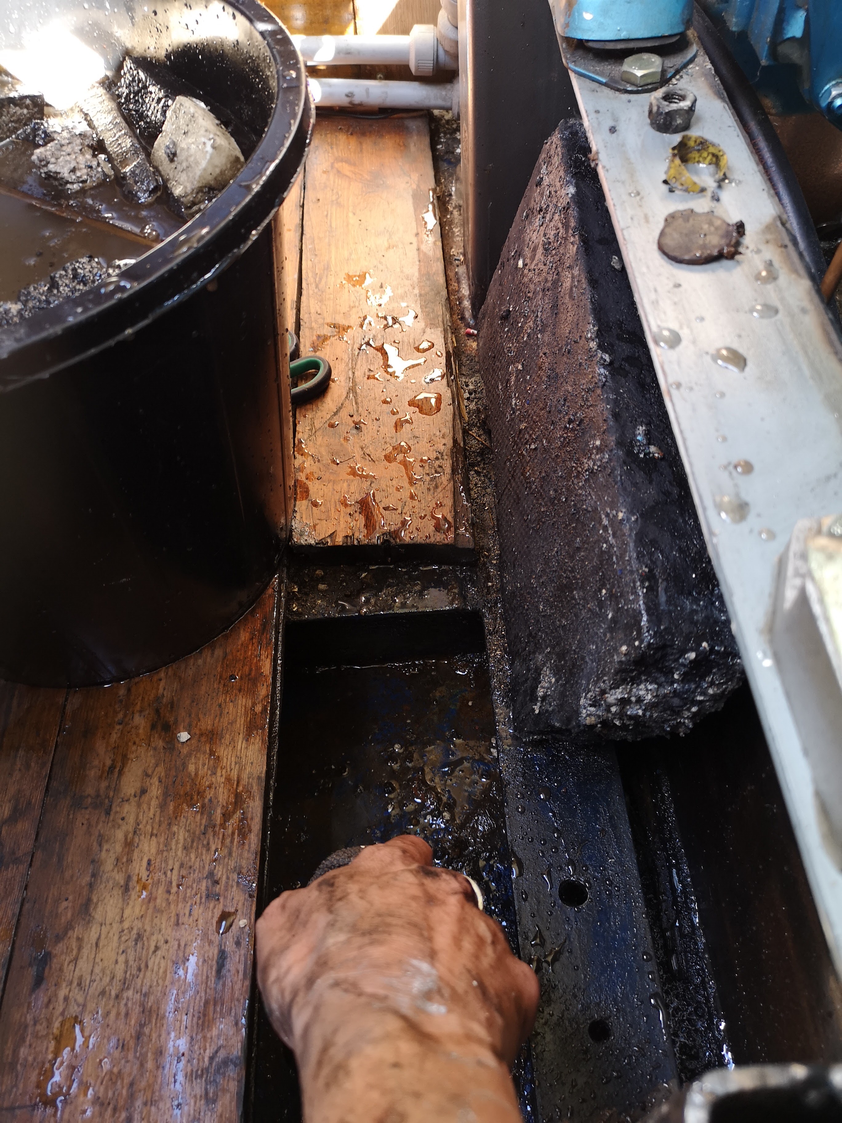 Once again, my arms are caked in fuel and water as I delve into the under belly of Misty Waters to mop up what I can. Sam fits the shower pump first which  brings us both joy as we see the water pumping out of the boat and where it should be.