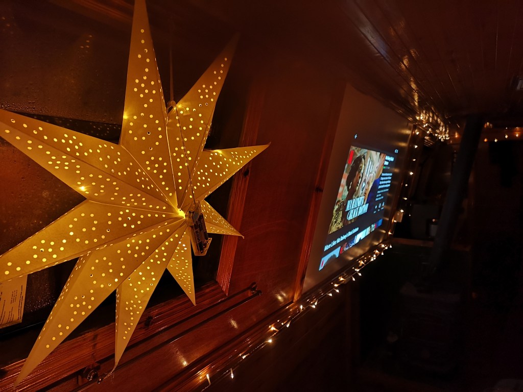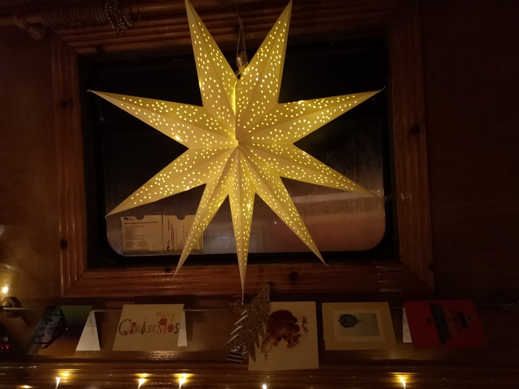 We spend the evening putting up Christmas decorations until we have a row or fairy lights circling the inside of the boat like stars. The stars of Christmas surround us.  For now everything is just perfect.