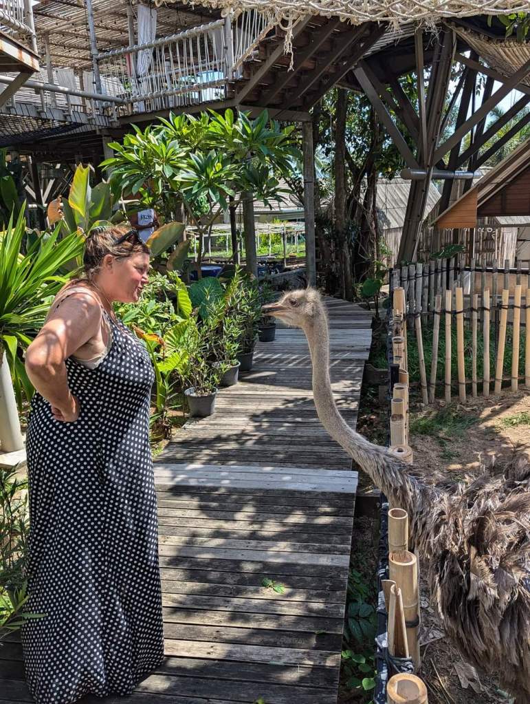 The next morning we are woken up by squawking chickens and roosters. Quite appropriate as Sam is a fire rooster and it’s her birthday. Nevertheless it is still a surprise. We discover that our room is situated above a farm. Even more of a surprise are the two rather large ostriches directly below us. Of all the things you expect to find in a hotel, ostriches are not one of them!