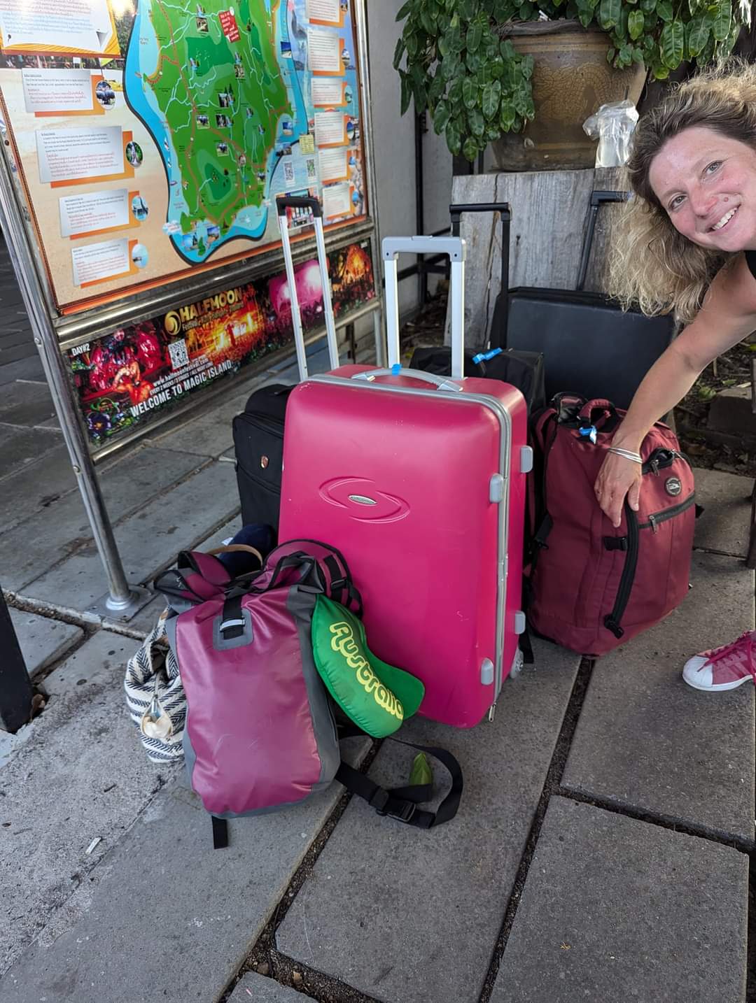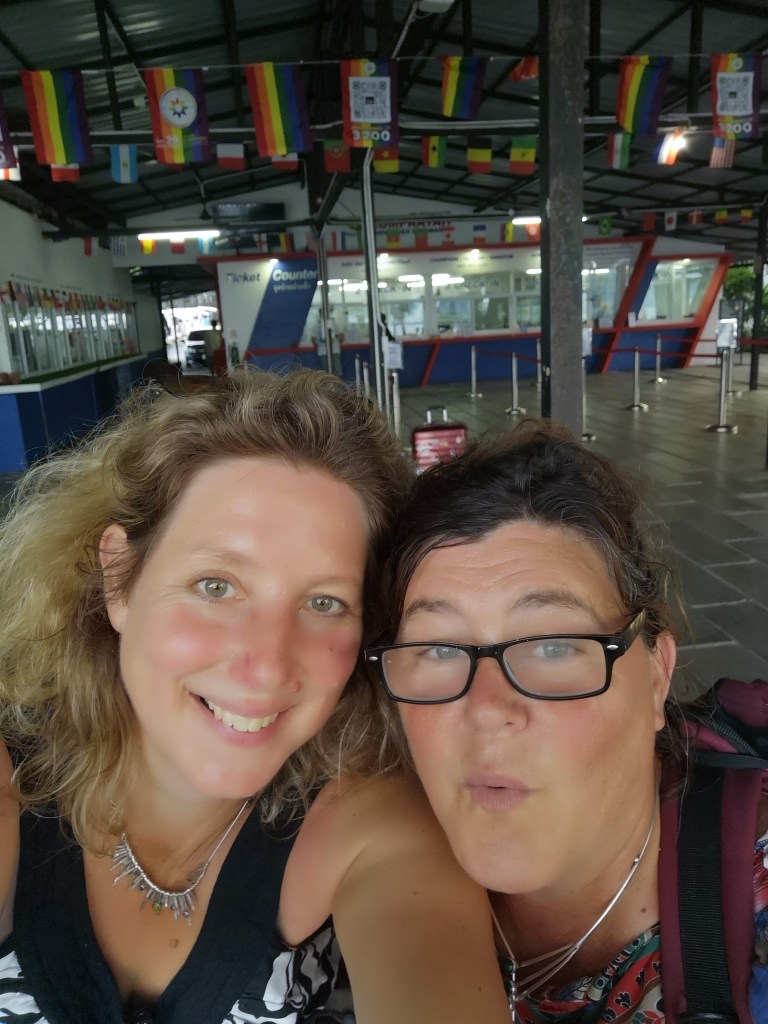 After what feels like every bag other than ours has found its owner, we are eventually reunited and we make our way off the boat and on to the jetty. Rainbow flags stand either side of it making our welcome a colourful one. It brings a renewed energy to our steps as we walk the path to our new life. We are both sweating so much it looks like we have been caught in a rain storm but it doesn’t matter.
