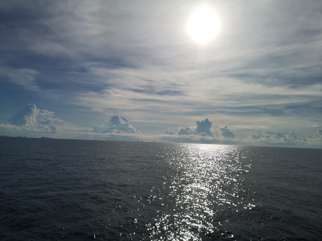 On the last leg (so to speak) we head to the back of the boat to watch for signs of our island’s approach. The boat is not sailing but ploughing through the sea at speed and the breeze is welcomed. Clouds sit low in the sky like icebergs and the sun on the sea makes it look like we are not at sea at all but in Antarctica. The sun pounding down on us tells us otherwise. I still look like a British holiday maker with my top unattractively placed over my head in an attempt to shade from the sun. I am still struggling to acclimatise to the heat.