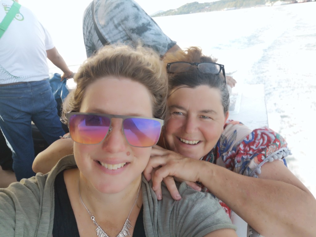 I have experienced these island ferry’s before and should have been prepared for the madness that ensued. Hundreds of people go on these boats every day. Their baggage is piled up like bodies in an open burial, by young Thais working hard in the midday sun. All you can do is hope that you’ll be reunited with your bag at the other end, when the burial site is excavated. You hope for some kind of system but there seems to be little sign of one. Our labels have long fallen off us, and the ones on our cases have also disappeared. Any feeling of bag security or health and safety has now gone. I wonder if maybe there will be a rope to hold? Or we’ll be asked to hold hands in pairs? But no, it is one big rugby ruckus and a case of “bundle”! I am reminded of the time my dad and I tried to get off a train in Sri Lanka (having completed our 2000 mile Tuk Tuk Challenge) As the train reached the platform we had to duck to avoid the suitcases and various personal items being thrown in through the train windows, and struggled to get off the train due to people trying to get on the train at the same time- we are lucky we didn’t get knocked out.
