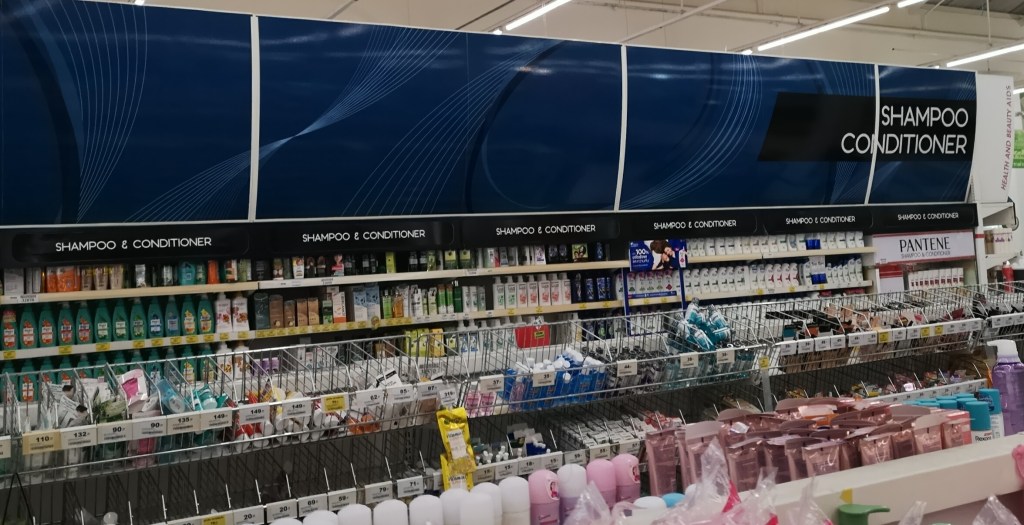 Our first stop is the 7/11, which is everywhere in Thailand. What happened to the good old 7/11 in the UK? The first thing I do is check out the shampoo and conditioner on sale. To see if it was worth forgoing the kitchen knives, the feathered pillows, and the cheese. It was not. I find a good selection of shampoos and conditions, all at reasonable prices. A few weeks later I am haunted once again by shampoo and conditioner, when I come across perhaps the biggest display of shampoo and conditioner I have ever seen in a supermarket.The aisle containing only shampoo and conditioner is so long that to get it all in the photo would involve the use of a panoramic setting! I was not amused.